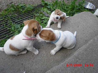 Valparna växer hela tiden och är pigga och alerta.Nedan ser ni de har fått på sig halsband det gick ganska bra men det är klart man får ju försöka klia av sig det om det går.