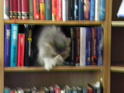 Pelle tyckte att det var precis lagom plats för honom mellan böckerna :))