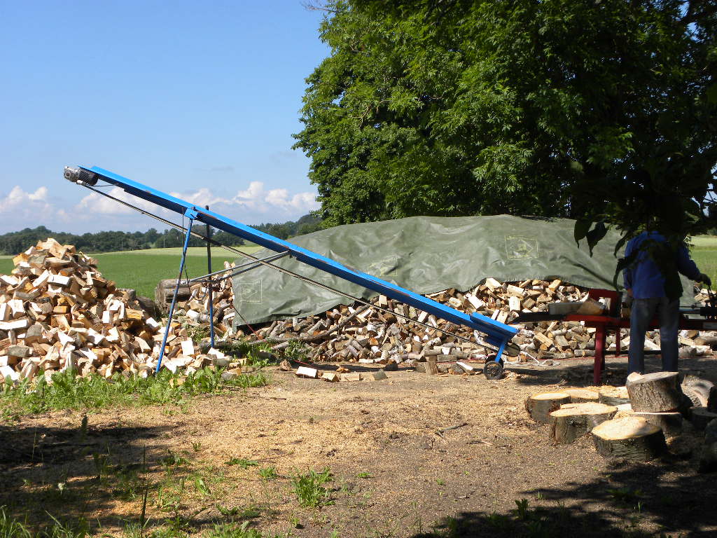 Mannen sliter hårt med veden.Men samtidigt så är han nöjd med att den kommer att värma gott i vinter.Han är duktig han :)