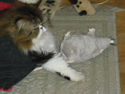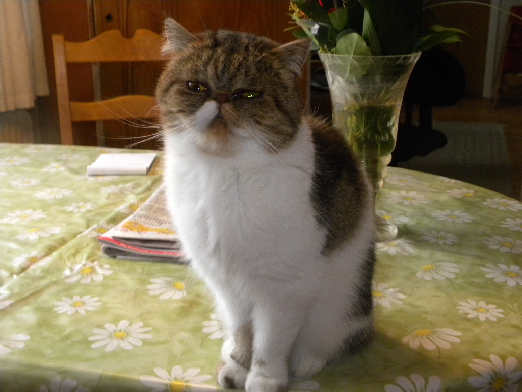 Mina älskade pälsmonster är fulla av bus.Till och med gam tanten.Busar runt och ser ut att må hur bra som helst för tillfället ni kan tro att jag är glad för det när jag betänker hur hon var när hon flyttade hit den 20070105.Ungarna hennes som fortfarande går under samlings namnet kattungarna och som är födda den 2007 08 08 är hur goa som helst.Gangstern som har utvecklats till ett verritabelt pälsmonster pratar som en kyckling och är otroligt kel och sällskaps sjuk.Han är den enda av "kattungarna " som är utställd.Han blev Champion på tre utställningar och därefter så blev det kastrering med tanke på att han har två systrar och mamma som går här.